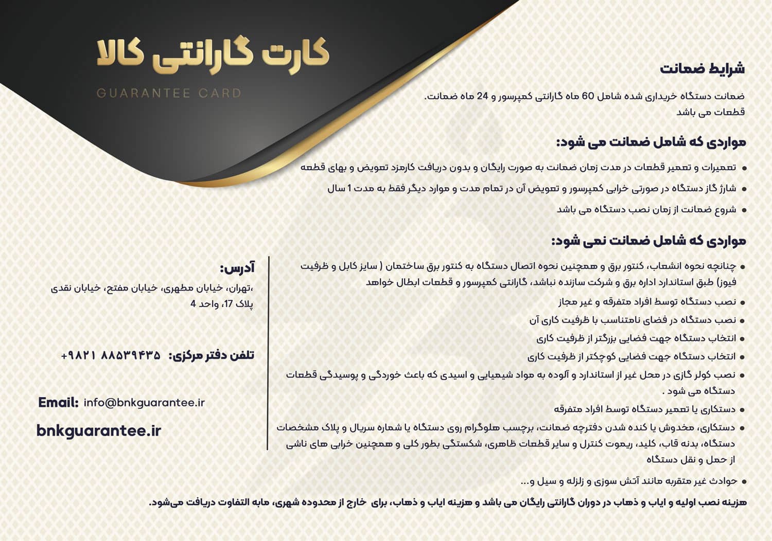 ضمانت دستگاه خریداری شده شامل 60 ماه گارانتی کمپرسور و 24 ماه ضمانت قطعات می باشد.